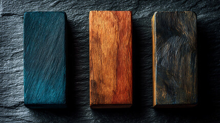 Three rectangular wooden blocks in teal orange and dark brown tones on slate background, modern natural material mockup for branding packaging and product presentation