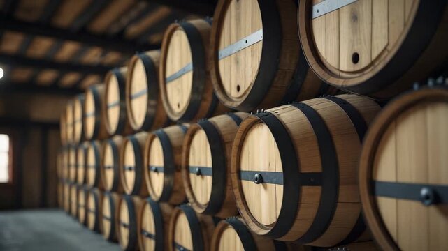 Wooden barrels stored in a large warehouse for aging various types of beverages in a dimly lit space