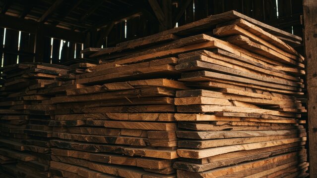 Pile of stacked lumber in an indoor storage area, warm and inviting light.