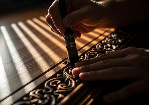 Carpenter cutting intricate designs into wood for a custom table. Featuring skill and artistry