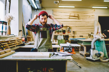 Emotional hipster guy in apron disappointed with failure during carpentry courses gesture raising up hands, upset bearded male artisan angry about trouble during creation handmade furniture details.
