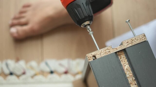 Craftsman assembling wooden furniture with screwdriver