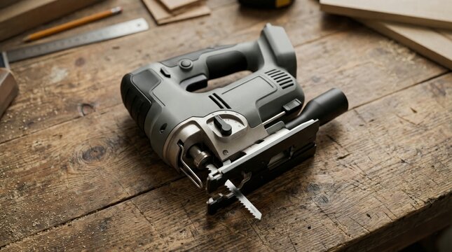 Electric jigsaw power tool on wooden workbench in carpentry workshop setting