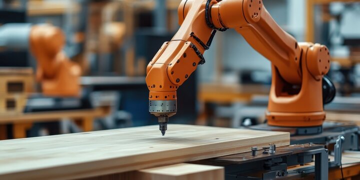 A robotic arm meticulously works on a piece of wood in a modern woodworking workshop, showcasing advanced automation technology.