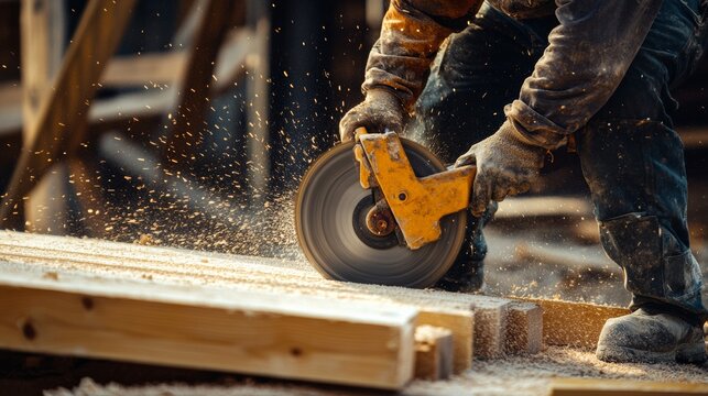 Close-up of a carpenter’s hands measuring and cutting a wooden plank with a saw, surrounded by woodworking tools in a workshop setting, showcasing the detailed process of wood installation