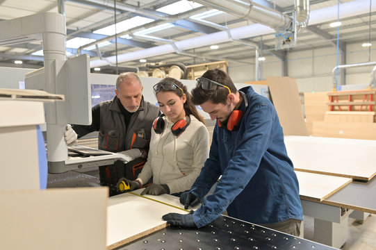 Young people in job training in carpentry workshop