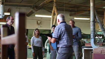 Carpenter, men and high five for work, skills and helping intern with tablet, woodwork and material. Warehouse, mature mentor and trainee with happy for craftsmanship, people or celebration for sales