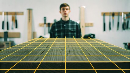 Focused individual stands in workshop surrounded by tools, emphasizing importance of vocational training in woodworking