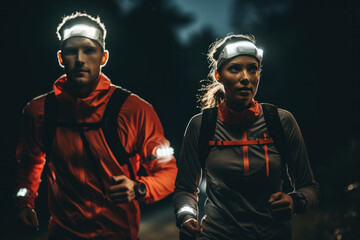 A group of runners wore headlamps and reflective gear for an early morning trail run. When the sun has not yet risen or at night