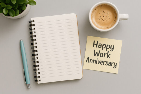 Happy work anniversary message on sticky note with notebook pen coffee cup and plant on desk creating happy work atmosphere for celebration and productivity