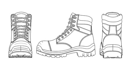 Monochromatic line art illustration of a heavy-duty work boot, presented in front, side, and rear views, emphasizing industrial safety and durable footwear design.