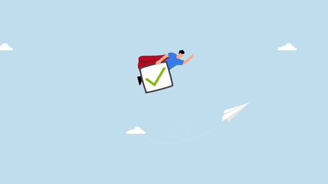 checkbox to complete work, 4k animation of businessman superhero flying with checkmark completion.