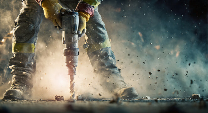 Construction worker using a jackhammer, breaking ground, heavy labor