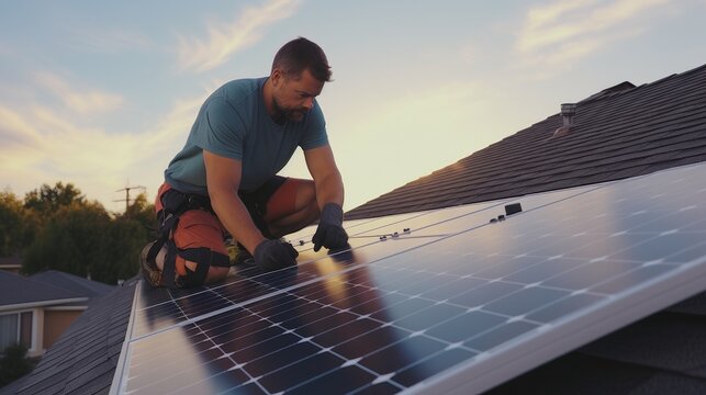 A dedicated worker carefully installs solar panels on a rooftop at sunrise, symbolizing progress and commitment to sustainable energy solutions.
