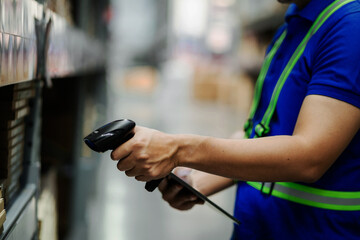 Warehouse employee scanning box in logistics and supply chain