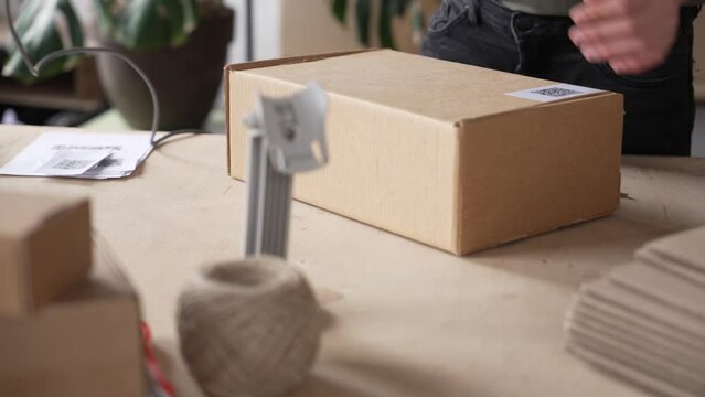 A man warehouse worker online store owner preparing parcel boxes checking e commerce shipping online retail e commerce store order fulfillment in dropship delivery post office