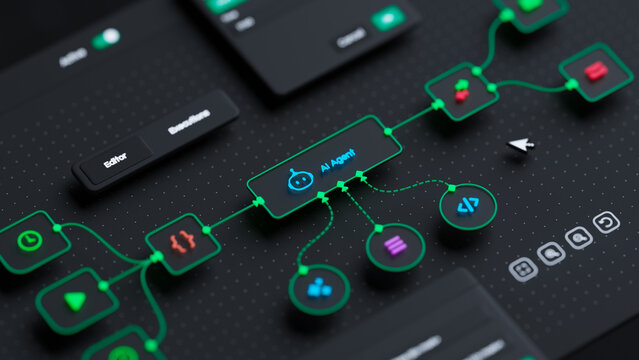 AI workflow automation artificial intelligence software interface nodes triggers data tool dashboard coding icon flow process technology 3d rendering.