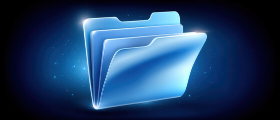 Glossy blue folder icon and glowing data ribbon evoke digital file storage and organized office workflow with soft light and modern tech atmosphere