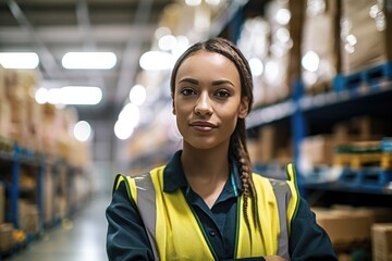 Portrait of confident female warehouse worker smiling for camera in work environment. Generative AI