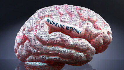 Working memory in human brain, hundreds of crucial terms related to Working memory projected onto a cortex to show broad extent of the condition and to explore concepts linked to it,3d illustration