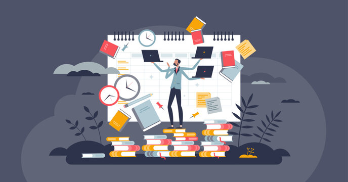 Overemployment and struggle about busy time schedule tiny person concept. Overworked workaholic with stressful multitasking vector illustration. Unhealthy balance with heavy workload and burnout.