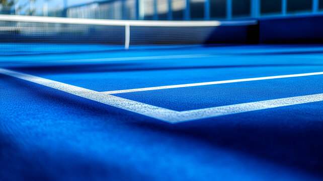 A close-up view of a bright blue tennis court with precise white lines during the day