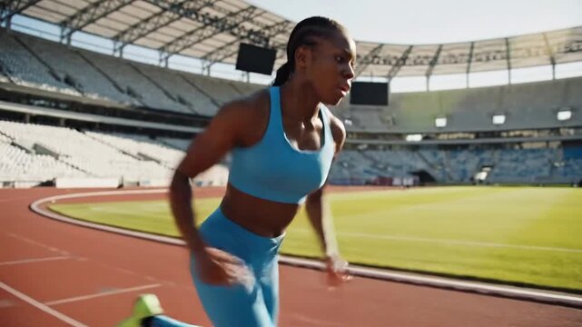 Female athlete running on track in stadium