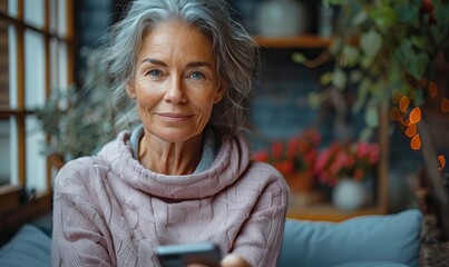 A beautiful, older brunette woman trains at home, holding a smartphone with a fitness app, working out like a senior female gym enthusiast.