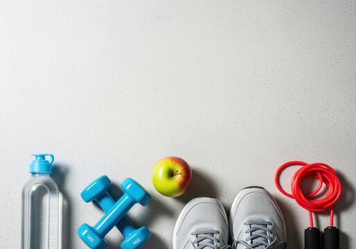 Fitness essentials arranged on a white surface, ready for a workout. This image showcases the necessary items for a workout, promoting a healthy lifestyle and physical activity