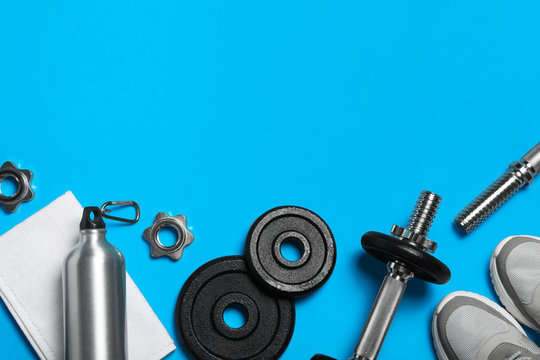 Workout equipment for training on pastel beige background. Flat lay, top view feminine sports sneakers, towel, dumbbells, t-shirt, elastic bands for fitness.