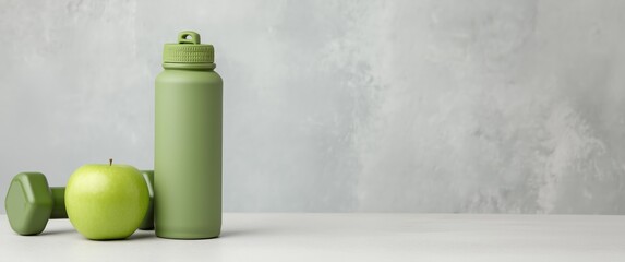 Green fitness accessories and a fresh apple symbolizing wellness, nutrition, and workout essentials on a white surface with copy space