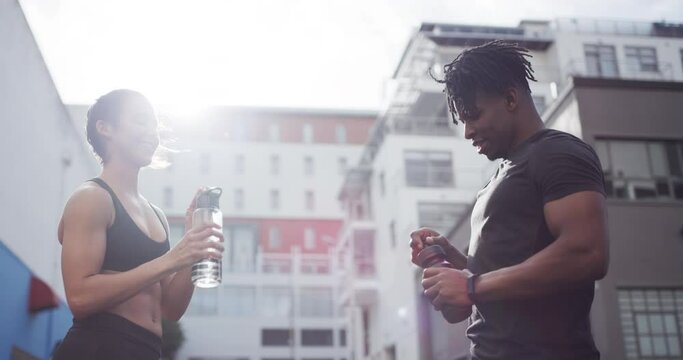 Man, woman and workout high five in city or exercise achievement for celebration, goal or wellness. Female person, partnership and friends or health support in street for sports, fitness or challenge