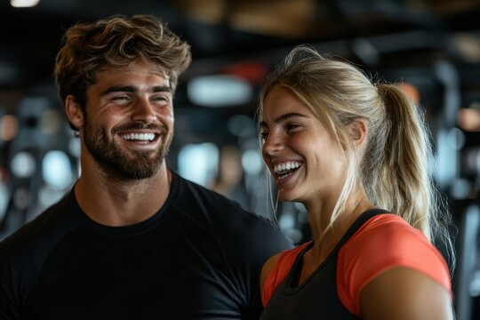 A cheerful duo, dressed in gym attire, sharing a light-hearted moment and enjoying their indoor workout session, illustrating companionship and physical fitness.