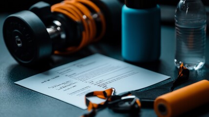 Fitness Plan with Dumbbells, Water Bottle, and Resistance Bands