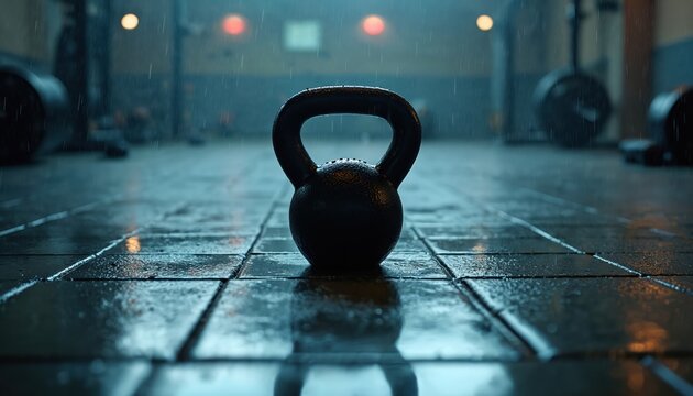 Kettlebell rests on gym floor. Workout equipment for exercise and fitness. Healthy lifestyle and power sport training. Weight and strength workout concept. Rainy day scene in gym indoors.