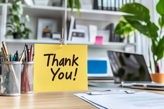 Thank You Card on an Office Desk During Sunrise. Warm and Inviting Workplace Setting with Sunlight Streaming Through Windows, Gratitude, Professionalism, and Positive Work Environment.