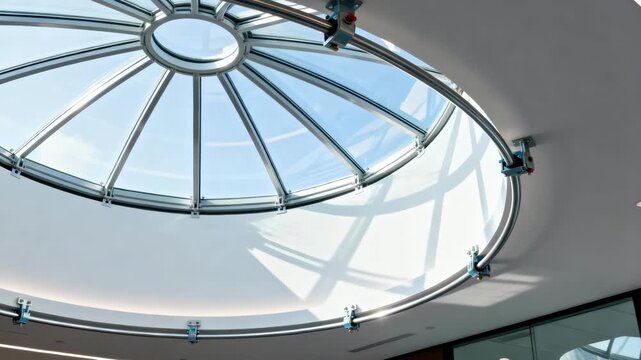 Sunlit modern office interior with large glass windows and a potted plant, displaying a serene and professional workplace environment at dusk.