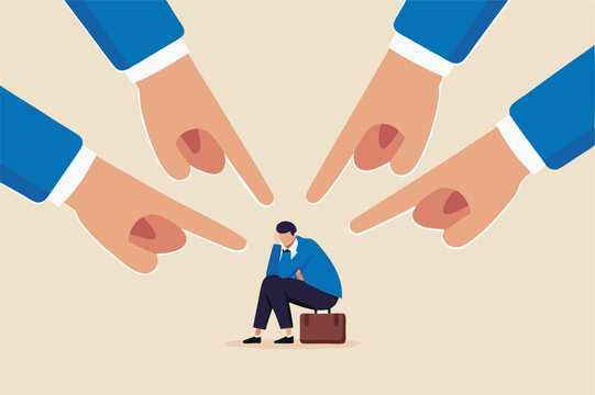 Toxic work, abuse or bullying colleagues, bad culture make exhausted depressed employee, fear of failure and responsibility, giant boss hands pointing and blaming at depressed businessman employee.