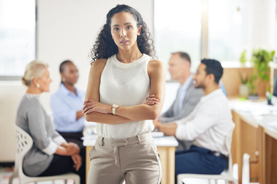 Manager, woman and portrait for meeting with businesspeople in office with confidence. Collaboration, workforce and party campaign for political vote in Belgium with strategy for president election.