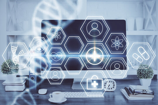Desktop computer background and DNA drawing. Double exposure. Science concept.