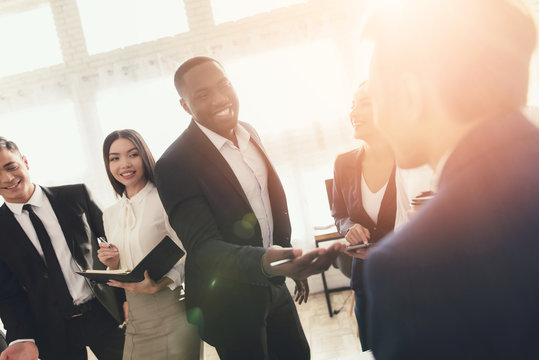 A group of young people holds brainstorming in the office.