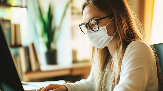 Businesswoman wearing face mask using hand sanitizer at office desk