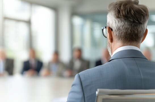 Senior executive in a business meeting viewed from behind, highlighting leadership and decision-making in a corporate environment.