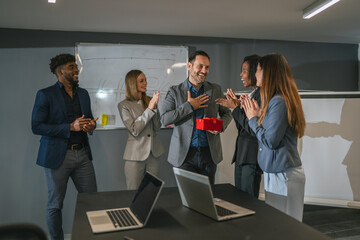 group of smiling professionals is seen celebrating or welcoming a colleague with applause in a bright, modern office environment