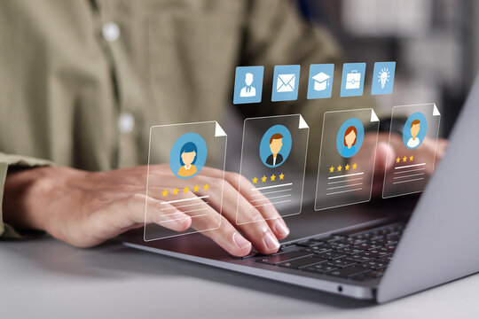 Hiring and recruitment concept. Presentation, Job interview, recruitment agency, HR manager uses laptop to select candidates.