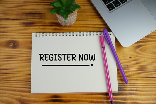 text of REGISTER NOW written on a yellow memo pad on cork bulletin board