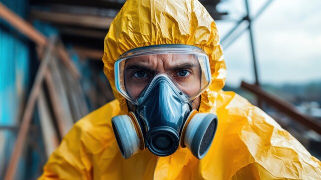 A close-up of a man wearing a protective yellow suit and gas mask at a construction site, highlighting the importance of safety and health precautions in hazardous environments.