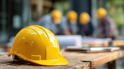Yellow hard hat on wooden table with construction workers discussing project plans in background, safety equipment for construction site management