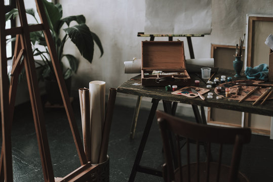 Table with artistic tools and easel on the left side