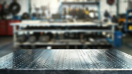Metal workshop plate tabletop garage with a lot of automotive parts and tools. mechanic workbench countertop table. Farewell work workroom. Realistic background. Garage full of stuff workbench